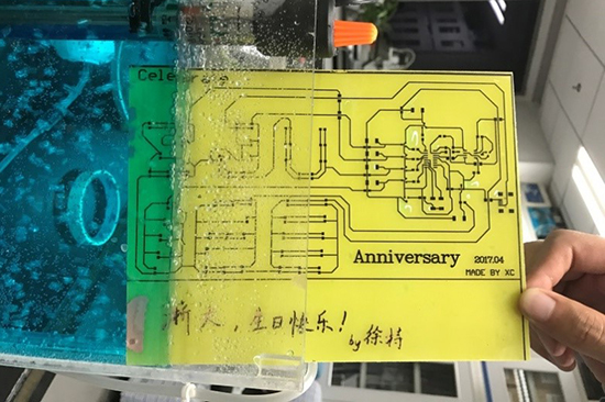 当构思完成后,同学们就用所学的电路软件绘制了原理图,再进行彩灯的电路板设计,这一步需要紧紧围绕创意。然后在实验室进行电路板腐蚀,把不需要的部分除去,最后进行元器件的焊接以及作品调试。