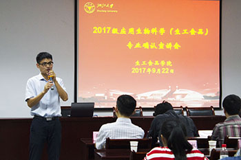 新学期第一周课程结束,新生专业确认工作已经临近。为了让同学们对所选专业有更为深刻的了解,2017年9月22日晚,生工食品学院组织召开了应生(生工食品)2017级本科新生专业宣讲会。农工系系主任王俊老师、食品系系主任罗自生老师、农工系副系主任冯雷老师、本科教学科科长郭亚芳老师、应生1704班主任林涛老师、云峰学园辅导员蔡明远老师出席,学院辅导员张云飞老师主持了本次宣讲会。