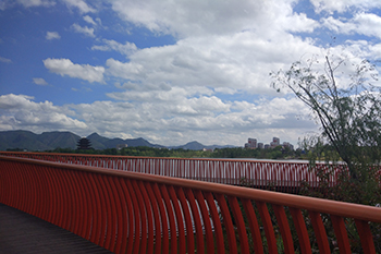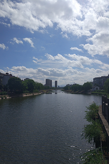 旅游业的开发是浦江县五水共治产业转型中极为重要的一环。为此,队员沿着浦阳江一路行至金狮湖。曾经的荒凉破败不再,虽仍在修建中,沿岸却是绿意盎然,被墨意气息点染:一桥一塔,楼近山远,云高水低,错落有致。湖面碧透,映出随风飘荡的云,微风一过,碧波荡漾。怀抱西子之含蓄,又近西施之温婉,可以预见修成之后的引人入胜。