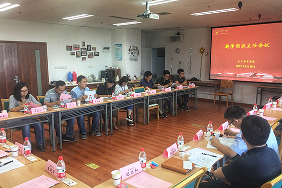 本科教学科郭亚芳老师对2017届毕业生毕业和学业情况进行了回顾和总结,针对2014级学生免研、毕业自审以及2017级本科生专业确认等相关教务事宜,向老师们做了讲解和说明,并对班主任老师的疑问做出详细解答。辅导员张云飞就近期学生工作进行了汇报,感谢并希望班主任老师一如既往地支持本科生学生工作。
