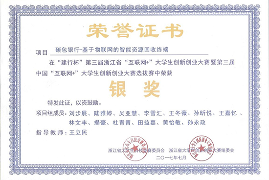 学院14级食品本科生陆雅婷、林文丰同学负责的“碳包银行-基于物联网的智能资源回收终端”项目获银奖(陆雅婷为二作)。