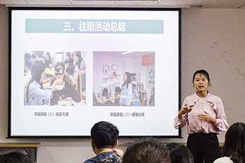 负责本学年心理工作兼职辅导员吕梦琪同学和上届兼职辅导员曹露露同学简要介绍学院心理工作和各类心理活动的开展情况,并表达了对心理委员团队“提升自身能力、关爱身边同学,传递正能量”的期待。