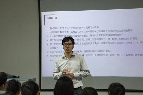 2017年10月17日,在党的十九大召开前夕,应生1704班第三次班会暨专业分享会在农生环D627召开。班会的主要内容是专业选择和未来规划分享与交流,李栋、周文泽、郑家琪、黄恩待、江昊、徐金凡和张梦垚七位学长学姐们受邀前来为学弟学妹们分享自己学习和成长的经验。
