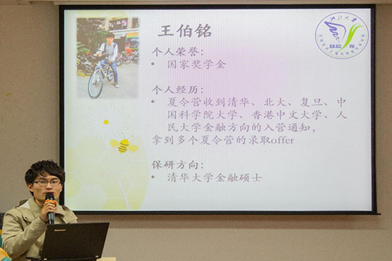 第一位为大家分享的是王伯铭学长。他获得了多个高校夏令营的录取通知书,最终选择去清华大学就读金融学。作为一名成功外推到外校外专业的学生,王伯铭学长首先给我们介绍了一些转专业所需要的准备,接着给在座同学分享了许多面试的小技巧,特别提到了要在面试中抓住自己的核心竞争力,从一个点发散开来介绍自己,在形式上创新,才能让面试官耳目一新。