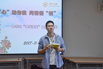 2017年11月11日上午,适逢“双十一”,浙江大学紫金港校区农生环D422活动室充满温情,房间里是轻柔的音乐,窗外洒满温暖的阳光。他们是在相亲吗?不,他们是在上课!“双十一”还上课?他们上的是“幸福课”!