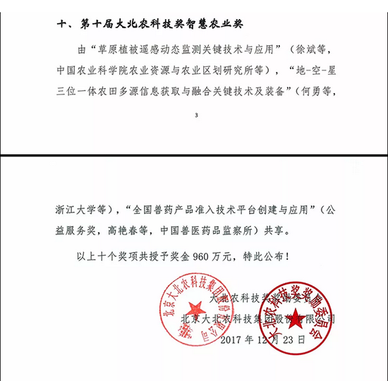 大北农科技奖是经国家科技部批准设立的面向全球农业行业的科学技术奖励,由北京大北农科技集团股份有限公司于1999年出资设立。奖励在农业应用研究领域作出突出贡献的科技工作者,旨在鼓励通过科技创新促进农业科技进步,促进农业科技人才成长与发展,引导科技资源在农业经济发展中发挥作用。本届科技奖坚持“公平、公正、公开”的评审原则,秉持公信和权威,严格评选十个奖项,共授予奖金960万元。