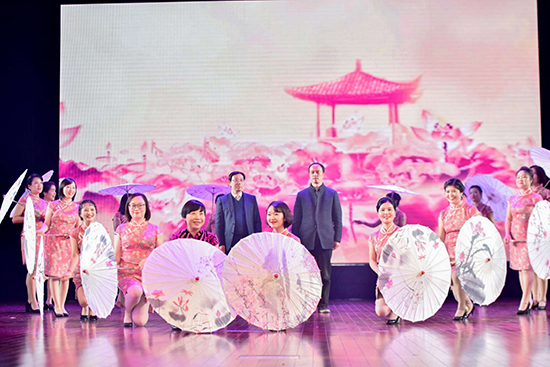 白色的纸伞在变幻的灯光下,随着教师们优雅的步子轻轻移动。女教师们一改平时教学科研的严肃,换上了典雅风韵的旗袍,撑着精致地圆形纸伞,一展曼妙身材,演绎出一幅幅水墨画,迷人而深邃,展现了东方之美。两位男教师,玉树临风,风度翩翩。这个由学院领导班子领衔的节目,让全体师生大饱眼福,掀起了晚会的高潮。
