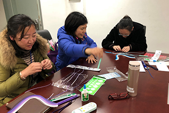 每位教工都专心致志的投入到自己的创作中,小小的纸条看着简单,做起来却不容易。每个部件都需要量尺寸,以及专门的小工具来标定规格。