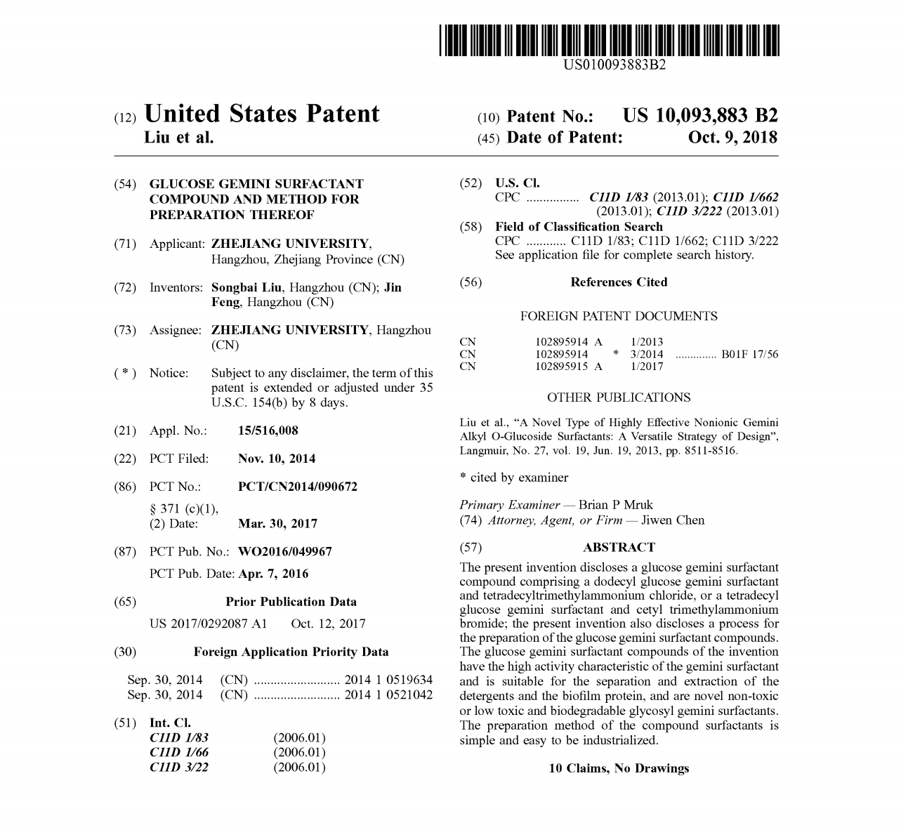 近日,bat365正版唯一官网刘松柏副教授研究组的研究成果——新型高活性Gemini烷基糖苷表面活性剂,正式获得美国专利授权(美国专利号:US10093883,授权日期:2018年10月9日)。