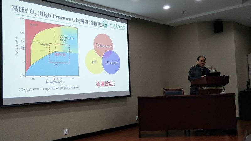 农业农村部食品非热加工创新团队领衔、中国农业大学食品科学与营养工程学院副院长廖小军教授做了题为“食品非热加工研究进展”的学术报告,介绍了食品加工中从颜色到营养等七个方面需解决的科学问题以及食品非热加工的优势与主要研究内容,讲述了基于压力的非热加工技术,并着重针对超高压二氧化碳结合温度(HPCD+MT)处理枯草芽孢杆菌(Bacillus subtilis)芽孢的杀灭动力学和杀灭机制进行重点探讨,并睿智生动地为现场师生答疑解惑,与bat365正版唯一官网师生就HPCD+MT技术在微生物安全控制中的优势等学术问题作了进一步的探讨。