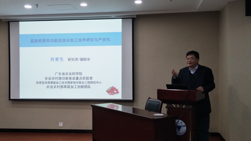 农业农村部果蔬加工创新团队领衔、广东农业科学院副院长肖更生研究员引用唐诗名句“一骑红尘妃子笑,无人知是荔枝来”开启了“荔枝的营养功能及综合加工技术研究与产业化”的精彩报告,以《食疗本草》等中医名著的记载介绍了荔枝传统中医养生功效,以现代科学研究情况介绍了荔枝的降血糖、护肝、抗肿瘤、调节免疫力等活性功能,介绍了荔枝加工利用中面临的科学技术问题,从世界荔枝产业格局、我国荔枝产业概况等几个方面介绍了荔枝加工产业背景,拟攻克的技术瓶颈、要实现的产品多元化以及推动荔枝加工产业发展的路径,并介绍了广东省农科院蚕业与农产品加工所及农村农业部果蔬加工创新团队的发展历程、主要研究方向以及在荔枝综合加工关键技术及产业化方面所做的贡献。