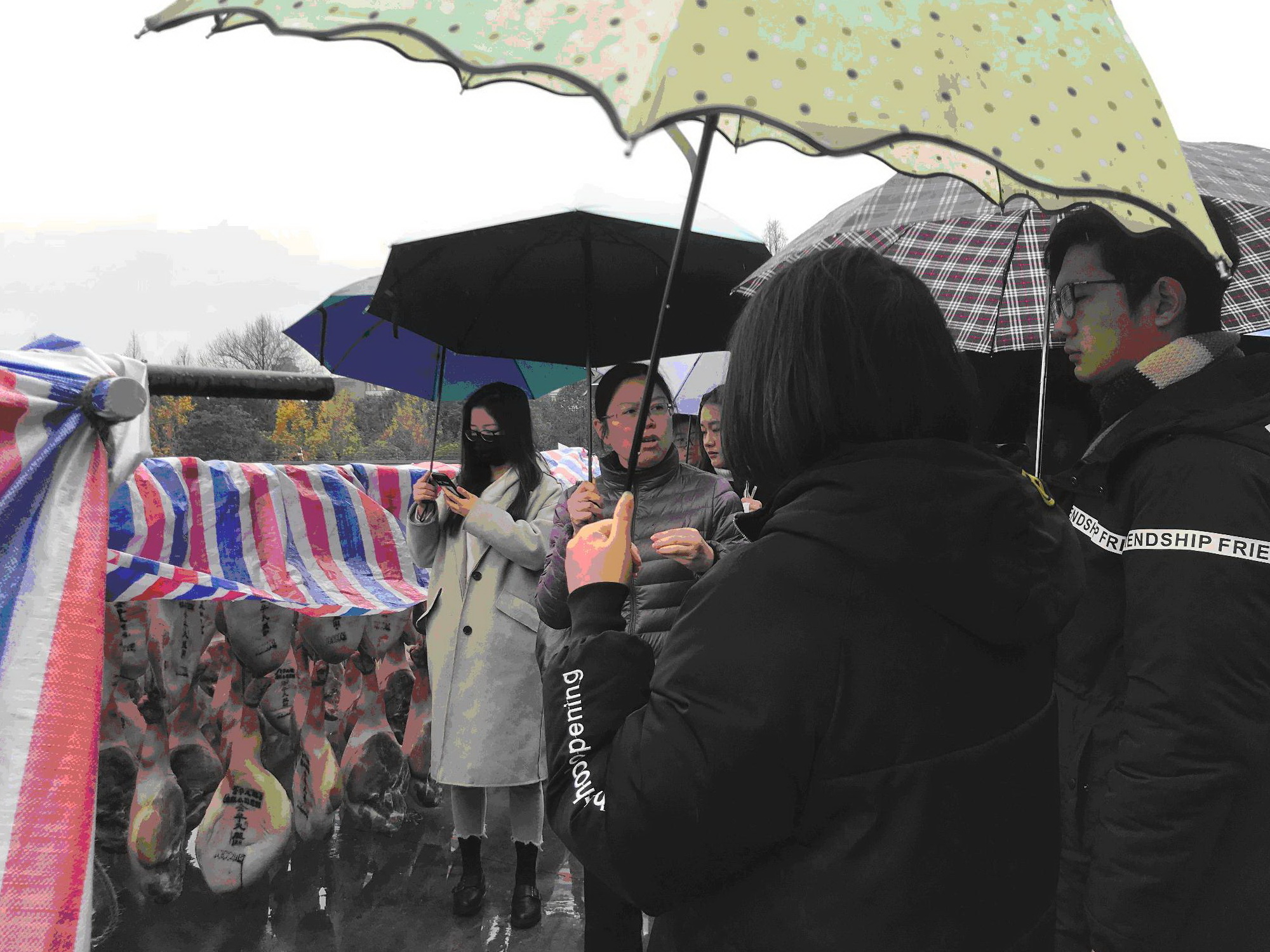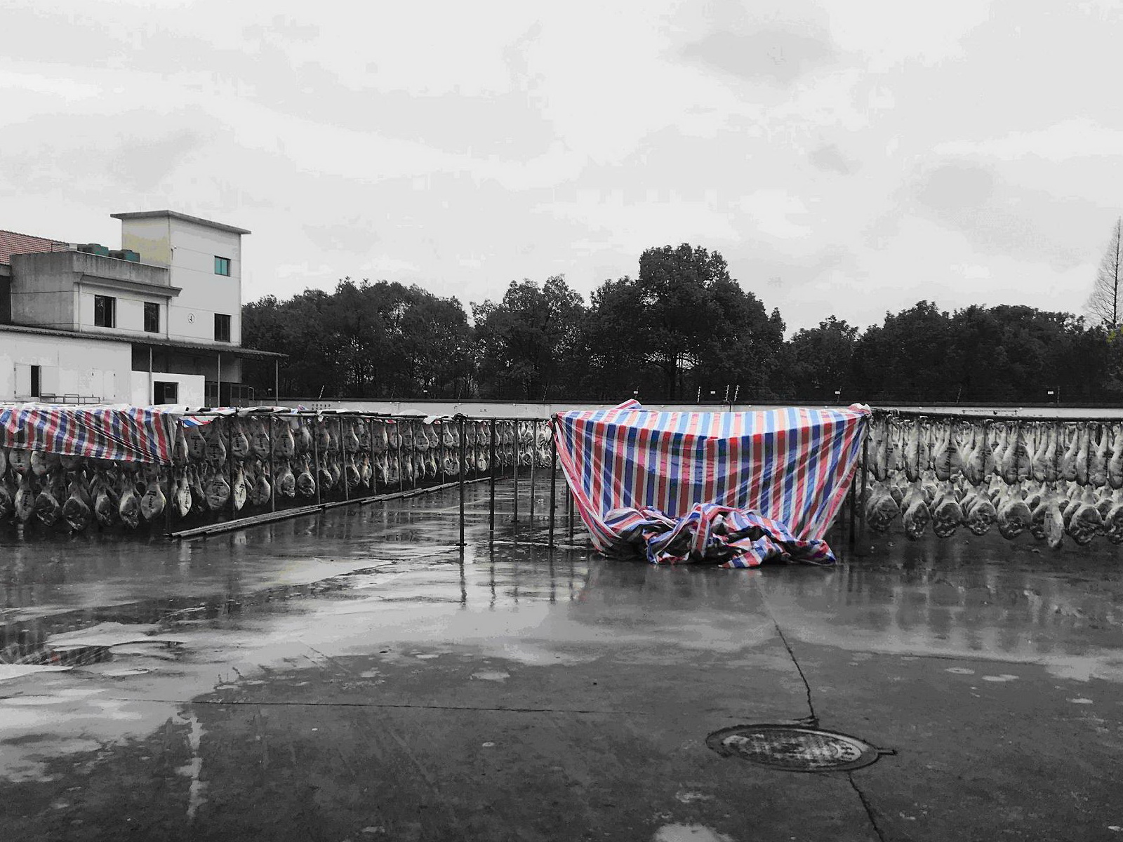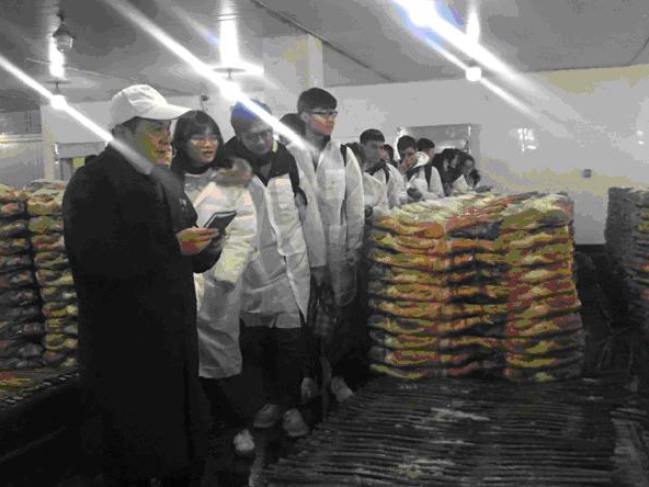 清晨八点,细雨微洒,同学们在紫金港集合,前往金华。三个小时的舟车劳顿并没有消减同学们的热情,初到金年蒋生产厂,见到广阔的晒场,大家都惊呼了起来。金年火腿有限公司许为民主任与吴老师为大家介绍了火腿的晒制与整形,虽然由于下雨不能看到师傅演示,但仍然不妨碍成千上万条腿给同学们带来视觉冲击。