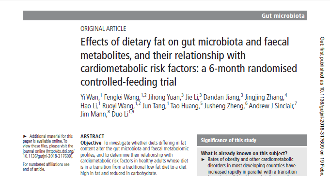 2019年2月19日,生物系统工程与食品科学学院李铎教授课题组在《Gut》杂志(影响因子17.0)上发表研究论文“Effects of dietary fat on gut microbiota and faecalmetabolites, and their relationship with cardiometabolic risk factors: a 6-month randomised controlled-feeding trial”。该研究揭示,高脂肪低碳水化合物饮食对健康人肠道菌群,粪便代谢物及血浆炎症因子产生不良影响,为高脂饮食的潜在危害提供了基于中国健康人群的证据。该论文一经发表就被英国医学杂志社(BMJ)、每日邮报(DailyMail)、美国新闻和世界报道(U.S. News& World Report)等十几家国外新闻媒体报道。