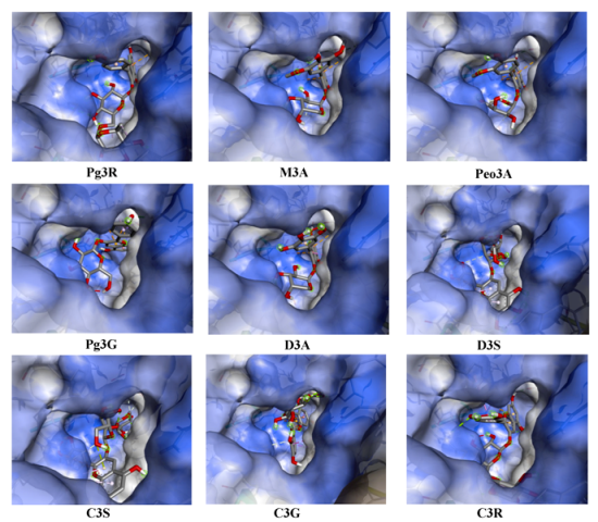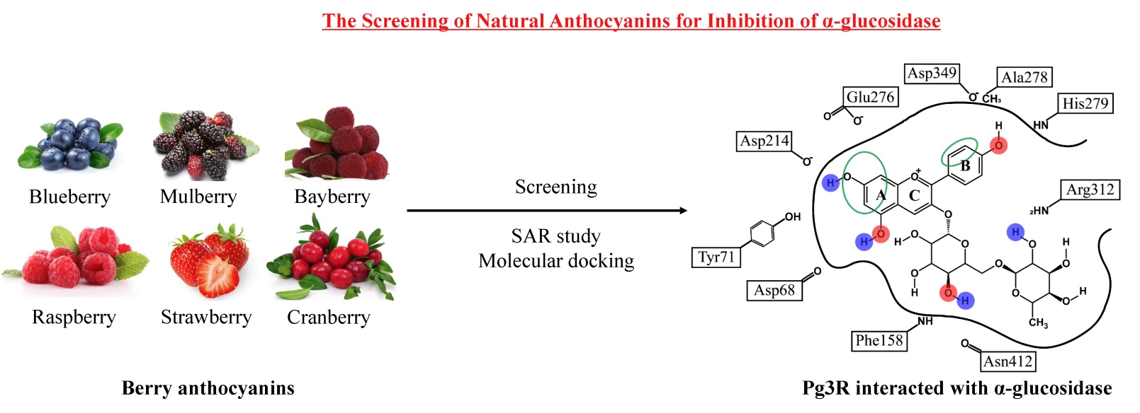 在最新的这项研究中,研究人员以蓝莓、草莓、红树莓、蔓越莓、桑葚、杨梅等天然浆果为研究对象,发现浆果花色苷具有显著的α-葡萄糖苷酶抑制活性。基于此,推测以2-苯基苯并吡喃为母核的花色苷可能是一种新型的天然来源的α-葡萄糖苷酶抑制剂。随后课题组建立了浆果花色苷的精准制备技术,从浆果中制备得到18种高纯度花色苷单体,并运用荧光光谱、圆二色谱和分子对接等技术系统阐明了浆果花色苷抑制α-葡萄糖苷酶的构效机制。该研究成果为定向设计与开发花色苷类新型α-葡萄糖糖苷酶抑制剂奠定了理论基础,具有重要的科学意义和潜在的应用价值。