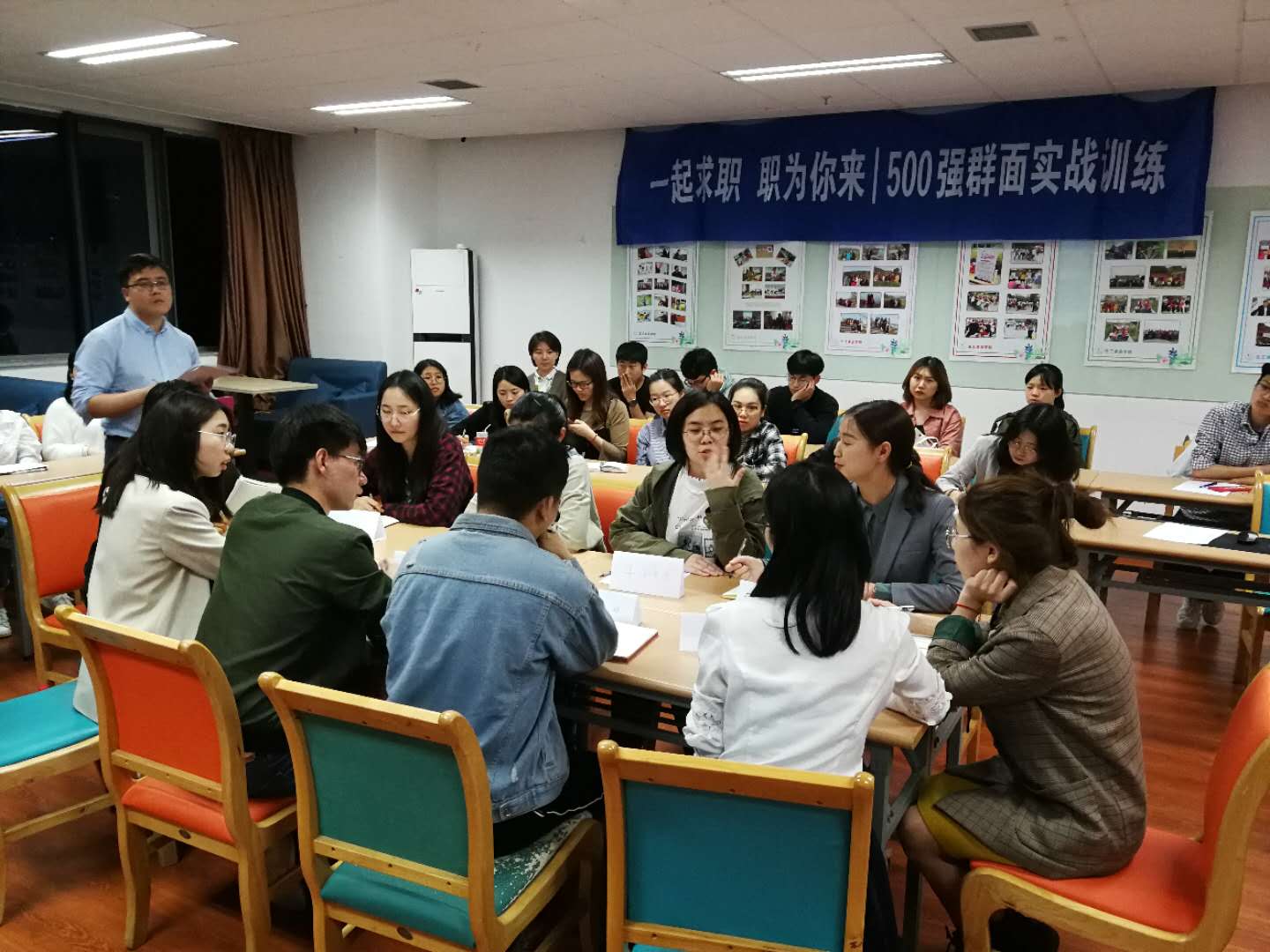 第二个环节是无领导小组讨论模拟训练。无领导小组讨论是采用情景模拟的方式对参与者进行集体面试。在很多公司的招聘中,无领导小组讨论都是面试中的重要环节。参加训练的同学们针对题目开始紧锣密鼓的准备工作,对问题进行深入剖析,为发言做准备。在轮流发言阶段,同学们都能流利地表达自己的观点,有理有据。在接下来的自由辩论和讨论阶段,小组成员畅所欲言一起探讨,最终形成有效解决问题的共识。最后是由小组的一名代表对整个小组的讨论意见做出总结陈辞,将整个小组观点进行凝练升华。整个模拟训练结束后,老师进行了专门点评和指导交流。