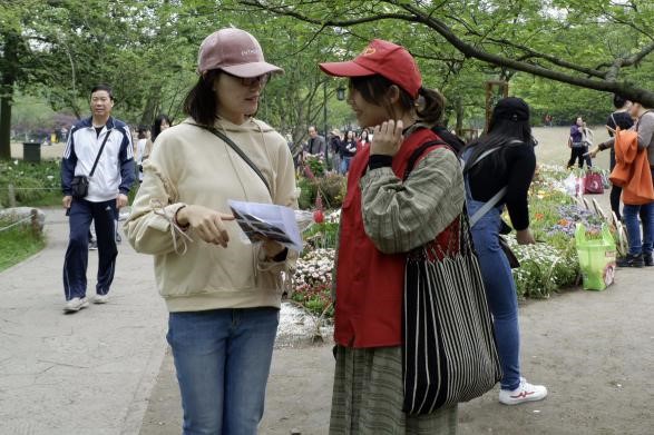 了解活动规则后,同学们陆续出发。在经纬度位置和照片的指导下,不少同学积极询问公园志愿者、保安等工作人员。在工作人员的帮助下,同学们获得了有用的线索,并直奔目标。