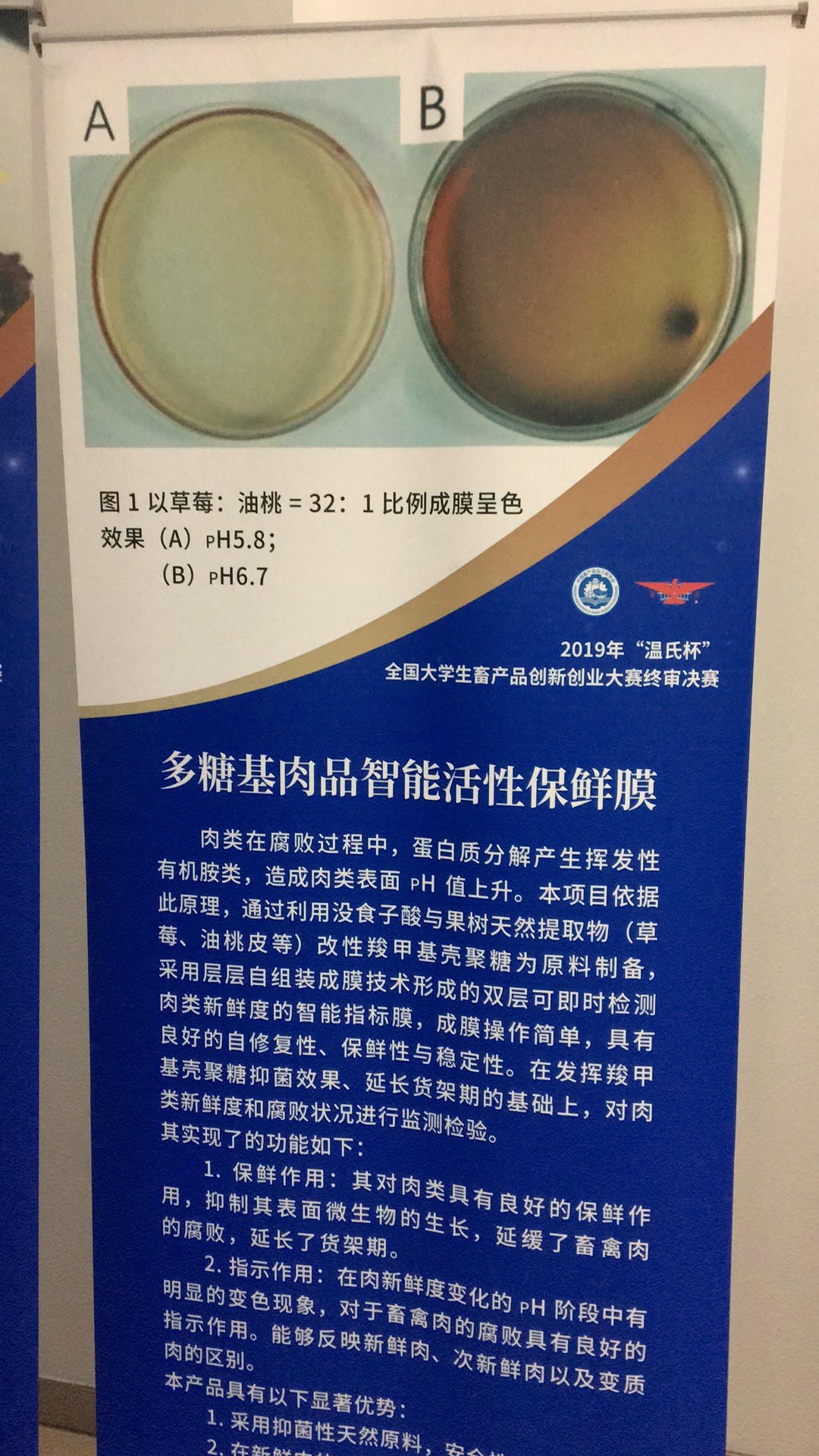 本次大赛的主题是“汇聚青年力量,谱写畜产华章”,由初赛和终身答辩两个环节组成。bat365正版唯一官网学子的参赛项目为“多糖基肉品智能活性保鲜膜”,通过利用没食子酸与果树天然提取物(草莓、油桃皮等)改性羧甲基壳聚糖为原料制备,采用层层自组装成膜技术形成的双层可即时检测肉类新鲜度的智能指标膜,成膜操作简单,具有良好的自修复性、保鲜性与稳定性。在发挥羧甲基壳聚糖抑菌效果、延长货架期的基础上,依据肉类在腐败过程中,蛋白质分解会产生大量挥发性有机胺类造成包肉类表面pH值上升的原理,对肉类新鲜度和腐败状况进行监测检验。