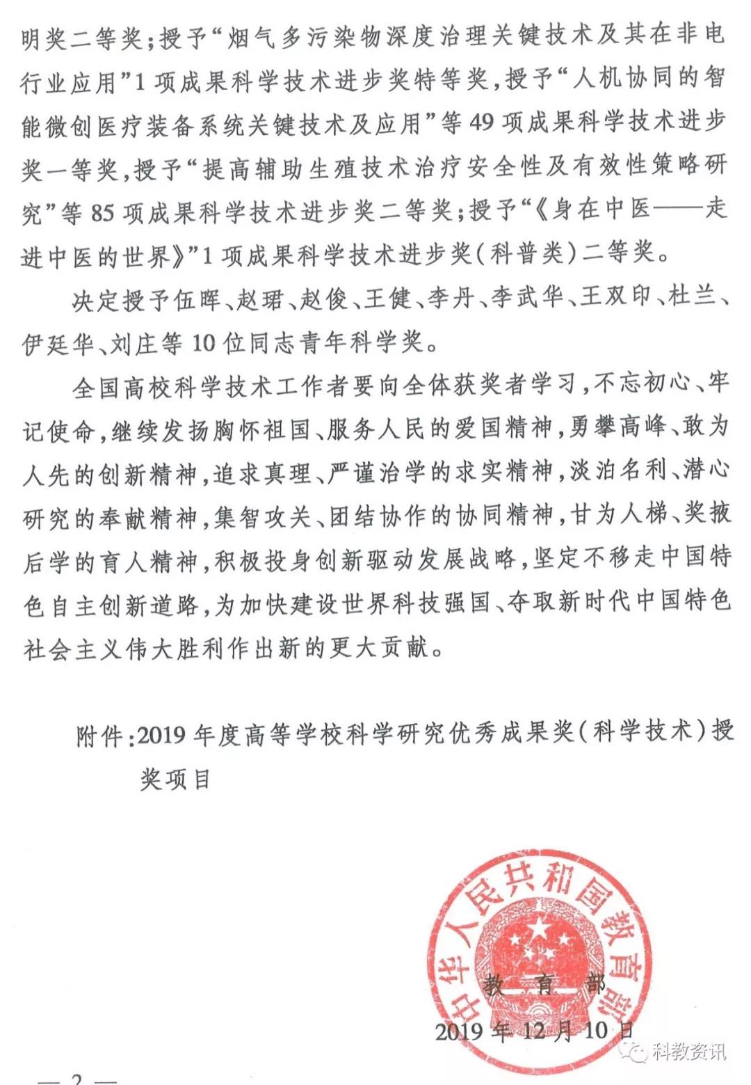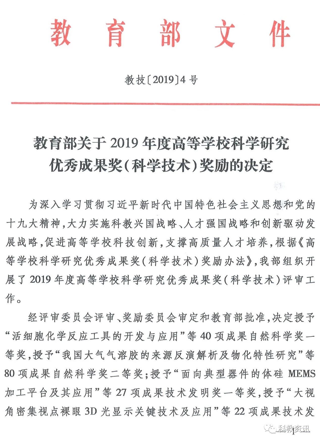日前,教育部发布《关于2019年度高等学校科学研究优秀成果奖(科学技术)奖励的决定》。由此,2019年教育部高等学校科学技术奖各类奖项、名单正式公布。
