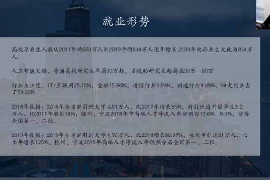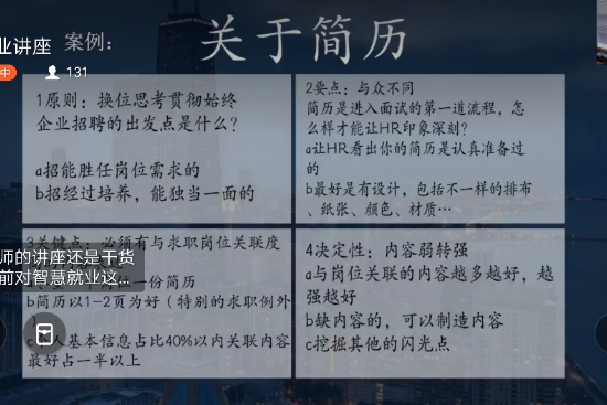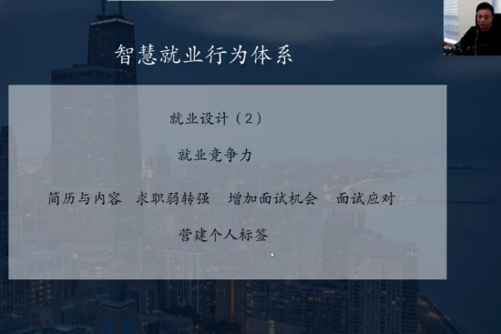 明确大环境后,耿宏强老师对智慧就业三位一体展开详细介绍。在智慧就业认知体系中,鼓励大家通过自我认知和社会认知解决就业困惑。同时以“杭州钱塘新区”,“人工智能起薪”为例,阐明我们的重点是透过现象看本质,只有了解国家政策和发展趋势,才能了解并适应规则。在智慧就业思维体系中,耿宏强老师讲述哈佛大学10年跟踪调查的案例,2%有着清晰定位并付诸行的人,创造的社会财富是其余98%的十余倍,以此简明扼要地指出“定位”的重要性。在智慧就业行为体系中,指出核心是就业竞争力,基于此,耿宏强老师从简历制作、面试应对和个人标签几个角度展开,告诫大家要着眼当前和未来的发展,多关注行业领军人物、前沿资讯。
