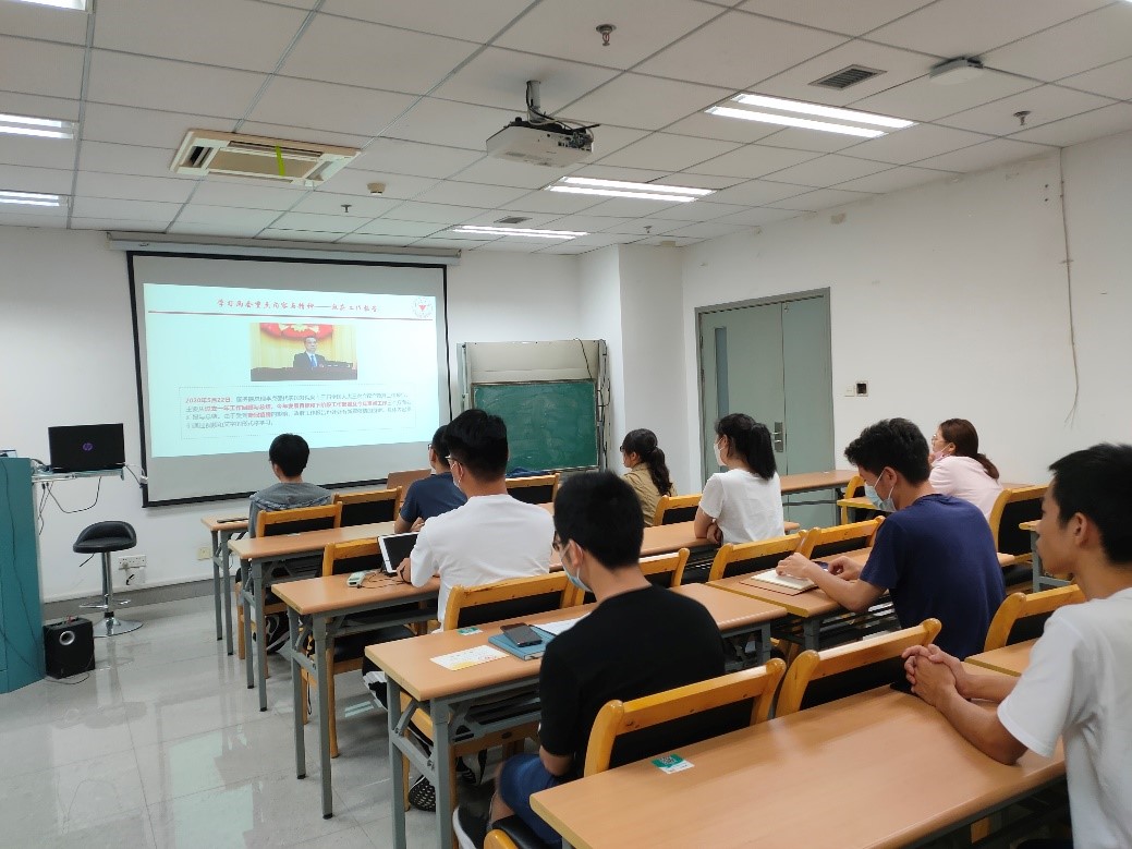 紧接着,我们进行了两会热点讨论。支部党员们就地摊经济、民法典和香港国安法各抒己见。吴焕宇同志提到,疫情期间恢复地摊经济,而不是一刀切去禁止,这对于经济恢复十分有益。吕梦琪同志表示赞同地摊经济是人间烟火气的说法,并且认为,可以和新基建等结合起来,具有一定的规划性;同时,一些互联网公司,将地摊作为一种新的招聘手段,也许对我们就业也会有一定帮助。陈佳奕同志认为,民法典的通过,使国家的法律法规更加完善,而热议的离婚冷静期,与我们的生活更是息息相关,因此我们要主动去关注,并且提高法律常识。牛子昂同志则认为,关于香港国安法,我们要有准备,要坚决维护香港和平稳定,同时6月5日,香港国歌法也刚刚通过,在香港如果有篡改、侮辱国歌的行为,都是要受到惩罚的,这表现出政府维护香港和平稳定的决心和信心。