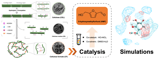 针对上述难题,该研究报道了一种从纤维素高效转化合成HMF的方法,该研究采用绿色可回收的甲酸对纤维素进行化学改性实现纤维素功能化,考察了甲酸改性处理对纤维素的化学成分与结构特性的影响,揭示了甲酸处理过程中纤维素大分子的演化机制;利用Lewis-Brønstedacid组合催化剂对甲酰化纤维素(celluloseformate,CF)于DMSO-H2O共溶剂体系中进行催化转化合成HMF,通过分子动力学模拟阐述了纤维素甲酰化修饰与DMSO溶剂的特定作用机理,构建了HMF的高选择性催化反应体系。