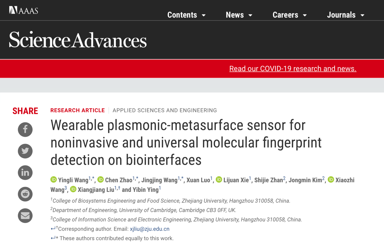 近日,浙江大学智能生物产业装备创新团队(IBE)刘湘江老师在《Science》子刊发表题为“Wearable plasmonic-metasurface sensor for noninvasive and universal molecular fingerprint detection on biointerfaces”的研究论文。该文首次报道了一种新型的柔性光学传感器,可实现生物体内多目标物分子的无损、实时、在线监测,填补了现有可穿戴式传感技术的空白。