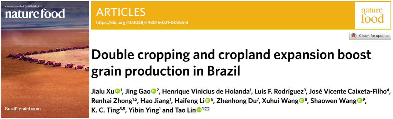论文相关信息:Xu , J., Gao,J., Holanda, H. V. D., Rodríguez, L. F., Caixeta-Filho, J. V., Zhong, R., Jiang, H., Li, H., Du, Z., Wang, X., Wang, S., Ting, K. C., Ying, Y., and Lin, T.* (2021) Double cropping and cropland expansion boost grain production in Brazil. Nature Food, 2, 264–273.