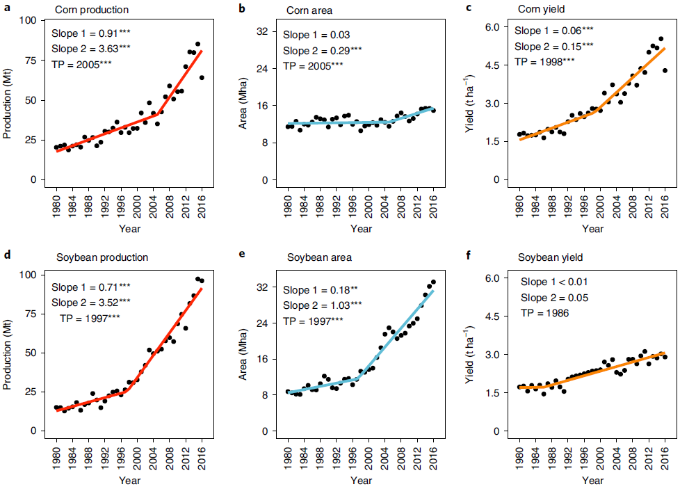 从1980年到2016年,巴西的大豆和玉米产量增长了四倍多(图2)。研究人员通过收集整理开放获取的相关统计数据(1980‒2016年玉米和大豆的县级单产、收获面积和总产量),量化分析了巴西在国家、区域和县三种空间尺度下双季种植和农田扩张两种策略对于大豆和玉米生产发挥的作用。在国家层面,农田扩张仍是主要的增长路径,尽管其贡献率逐年下降,在2016年仍贡献了65%的总面积增长;而双季种植的贡献率则逐年增加至35%。双季种植和农田扩张都显示出时空格局的差异和变化:在巴西南部的传统农业地区,双季种植占主导地位;在中西部和马托皮巴(东北部新兴农业区),农田扩张仍然是主导策略。在2003-2016年期间,巴西通过双季种植节省了约11.6亿亩的农田面积。巴西双季种植的时空变化量化分析研究为如何在已有耕地上提高粮食产量提供了一个新的角度和思路,对保障全球粮食安全和减轻土地负担起到重要参考作用。