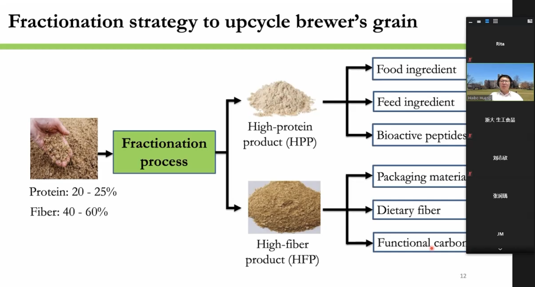 Nearly 30% of food is being wasted globally, resulting in billionsof dollars of economic losses, including the food itself and associated water,energy, and chemicals spent in the food supply chain. In this presentation, Dr.Huang stated the current situation of food waste around the world. He talkedabout how processing technologies were applied to convert food wastes intohigh-value food ingredients and functional energy storage materials, with thepurpose of reducing food waste, recover resources, and promote sustainability. Themarket price of protein increases exponentially with the protein concentrationin the product. Dr. Huang set the brewer’s grains as examples to help studentsbetter understand the processing methods, illustrating that brewer’s grainscould be divided into high-protein products and high-fiber products to achievecomprehensive utilization.