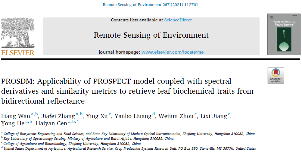 原文来源:Wan, L.; Zhang, J.; Xu, Y.; Huang, Y.; Zhou, W.; Jiang, L.; He, Y.; Cen, H. PROSDM: Applicability of prospect model coupled with spectral derivatives and similarity metrics to retrieve leaf biochemical traits from bidirectional reflectance. Remote Sensing of Environment 2021, 267, 112761.
