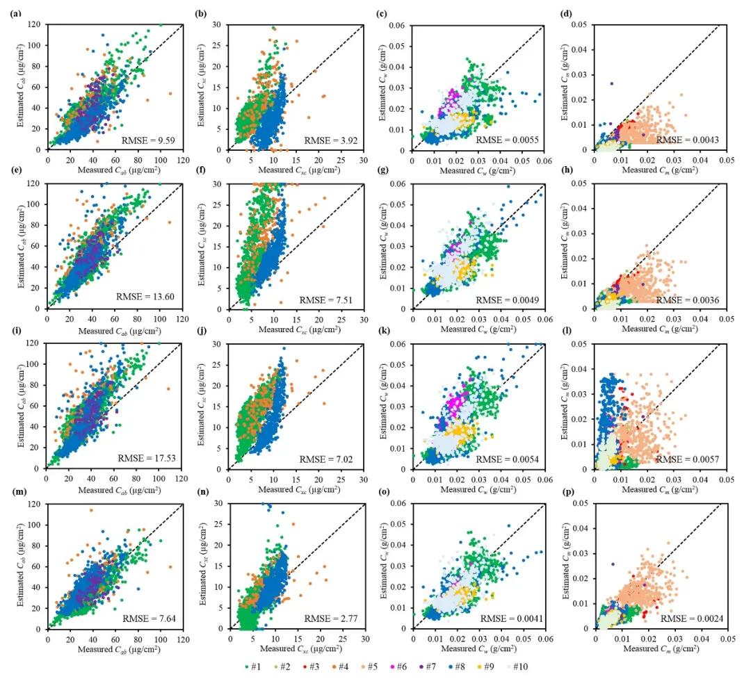 图3 基于不同反演方法的叶片生化参数评估结果:(a-d)PROSPECT,(e-h)PROCOSINE,(i-l)PROCWT,(m-p)PROSDM
