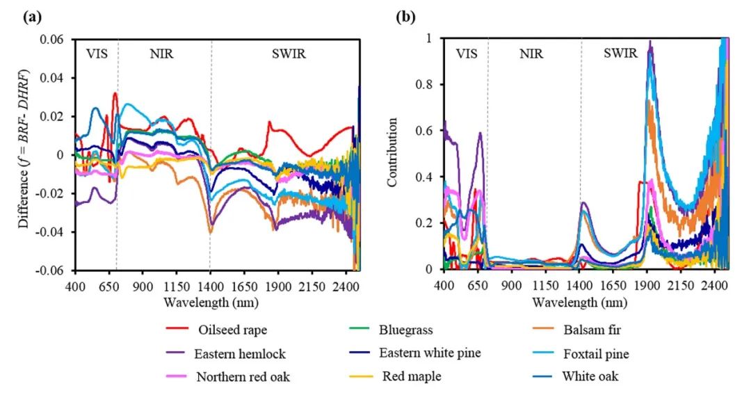图1 不同植物物种的叶片双向反射和方向半球反射光谱差异及其对双向反射光谱的贡献