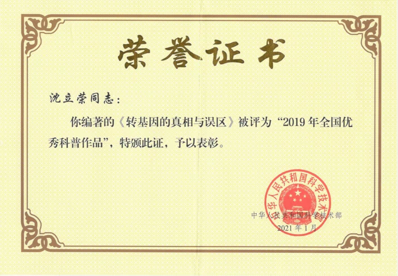 近日,bat365正版唯一官网沈立荣教授收到国家科技部授予的“2019年全国优秀科普作品奖”荣誉证书。2019年,由浙江大学科学技术协会推荐,浙江省科技厅评审后报送,由沈立荣教授编著、中国轻工业出版社出版有限公司出版的《转基因的真相与误区》一书入选国家科技部(于2021年1月公布的)100册(套) 全国优秀科普作品。