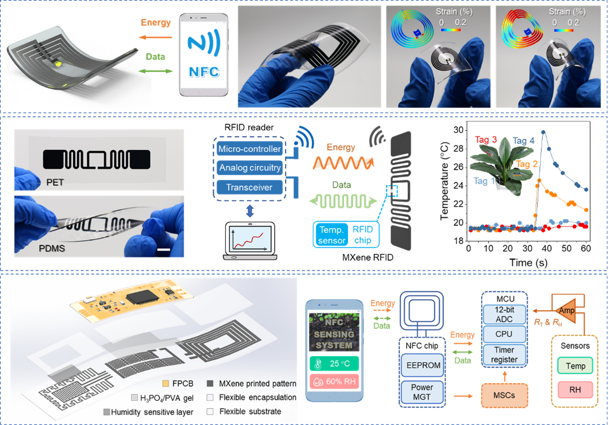 在计算机图案设计辅助下,MXene水性油墨和挤出打印技术的组合可以实现任意定制图案的高分辨率快速打印。例如,研究人员使用MXene水性油墨制备了近场通讯天线,可以实现无线信息识别和能量传递功能。研究人员还打印了具有温度测量功能的射频识别标签,可以远距离监测叶温和人体表面温度。另外,使用这一室温打印策略还可以实现复杂器件的一体化印制。研究人员展示了一套全MXene打印的集成感知系统,能够快速获取环境中的温湿度信息,同时支持无线通讯和能量存储功能。
