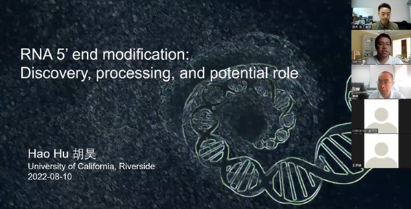 2022年8月10日,来自加州大学河滨分校(University of California, Riverside)陈雪梅院士团队的博士后胡昊博士受邀进行了以“RNA 5’end modification: Discovery, processing, and potential role”为题的学术报告。