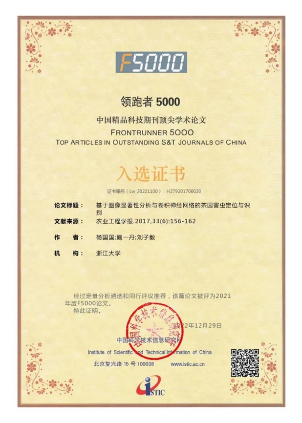 近日,中国科学技术信息研究所举办了“2022年中国科技论文统计报告发布会”,会上公布了2021年度“领跑者5000—中国精品科技期刊顶尖学术论文”(简称F5000)入选名单,bat365正版唯一官网农业信息技术研究所研究生杨国国为第一作者指导教师鲍一丹为通讯作者发表的论文《基于图像显著性分析与卷积神经网络的茶园害虫定位与识别》(农业工程学报, 2017, 33(6):156-162.)入选2021年度领跑者5000中国精品科技期刊顶尖学术论文。