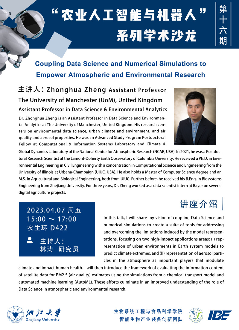 “农业人工智能与机器人”系列学术沙龙——Coupling Data Science and Numerical Simulations to Empower Atmospheric and Environmental Research