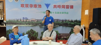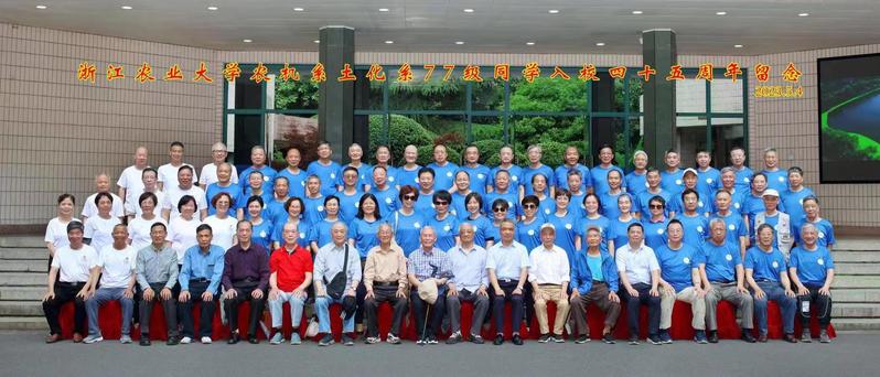 5月4-5日,春正盛绿荫浓,华家池、启真湖,湖水荡漾,鸟语花香,身穿蓝色或白色T恤的一拨拨人群,精神抖擞,或漫步在华家池畔,或穿行在林荫道上,欢声笑语,打破了“五一节”后校园难得的宁静。生工食品学院原农机系、环资学院原土化系77级近七十位校友与部分当年任课老师一起相聚在华家池、启真湖畔,共同纪念校友们入学45周年。