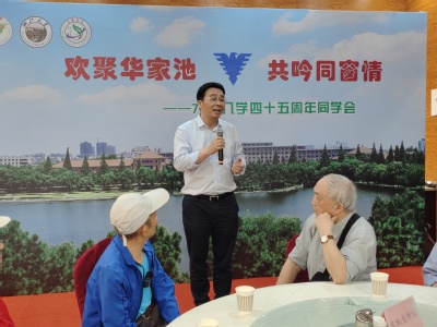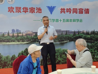4日下午,校友及老师们在留下45年后再相逢的难忘瞬间(合影)后,走进华家池校区农耕文化馆,重温浙江农业大学、浙江大学及两院系的发展历史。回到后稷馆,两院系校友、老师一起相聚在池畔苑,举行了别开生面的师生、同学欢聚交流会。浙江省科协副主席、浙江大学发展委员会副主席应义斌代表学校到会祝贺、问候、致辞,对校友们重回母校、相聚学院表示热忱的欢迎,对校友们长期关注、支持学校、学院建设发展表示诚挚的感谢。致辞中,应义斌副主席向校友们简要介绍了浙江大学快速发展情况,并与校友们分享了他对校友之间及校友与学校之间关系的深刻理解。原浙江农业大学党委副书记邹先定作为任课老师代表致辞。生工食品学院党委书记李金林、环境与资源学院党委书记陈丁江分别代表两个学院致辞,祝贺同学会顺利召开。张明发校友作为同学(校友)代表发言。
