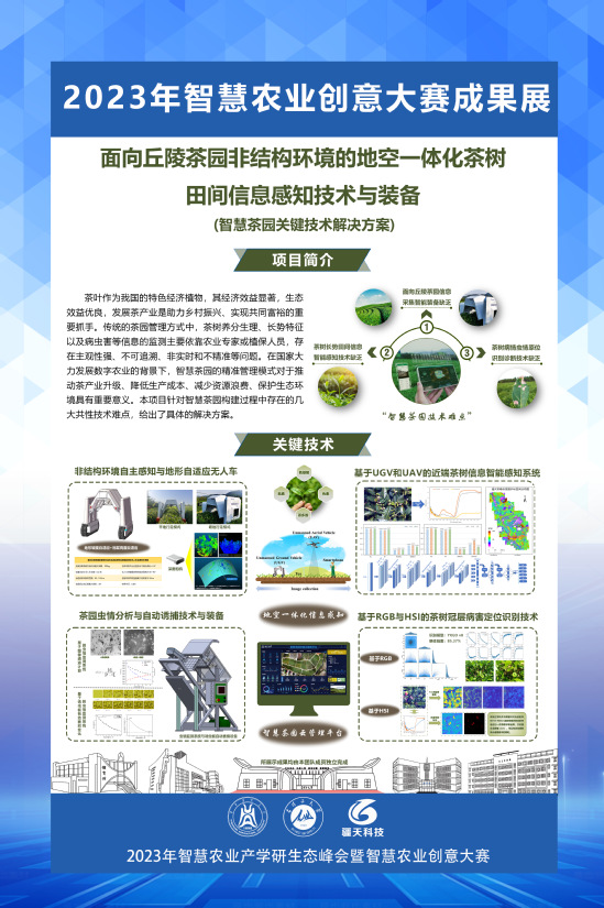大赛以“数字赋能乡村振兴,智慧助力农业强国”为主题,着眼于“大田作物生产智慧管理”,激发参赛者开发、设计和改进有助于农作物生产和信息技术深度融合的解决方案,为实现智慧农产品运营提供更科学的解决方案。本次创意大赛共有来自全国26所高校,涉及36个学院的137个参赛队伍报名参赛,经专家评审,最终选出12个参赛团队进入最终决赛路演环节。bat365正版唯一官网研究生张文凯作为参赛团队队长在决赛的现场路演环节表现优异,经过激烈角逐,团队项目《面向丘陵茶园非结构环境的地空一体化茶树田间信息感知技术与装备(智慧茶园关键技术解决方案)》斩获大赛一等奖。