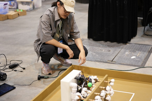 对于高级组Out of Bounds队来说,一个人利用赛前仅有的一天来调试两台机器人,并适应场地是最困难也最考验团队协作能力的。“虽然国内也会设置模拟场地进行演习,但到了现场才发现赛场内棉花布置的松紧程度、场地光线的强弱、赛台的颜色都有差别,我们需要在不到十二个小时内进行测试和完善。”出国参赛的高级组队长,2020级本科生盛泽楠用“惊心动魄”来形容这次赛前调试。