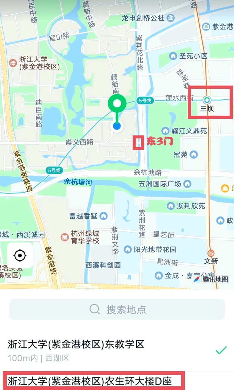 交通线路:地铁2号/5号线,三坝站→萍水西街(西)到底→左转→紫荆花路(南)→紫金港校区3号门进。