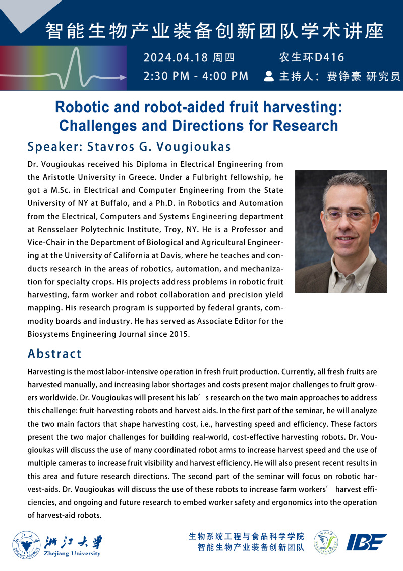美国加州大学戴维斯分校Stavros Vougioukas报告会- Robotic and robot-aided fruit harvesting: Challenges and Directions for Research