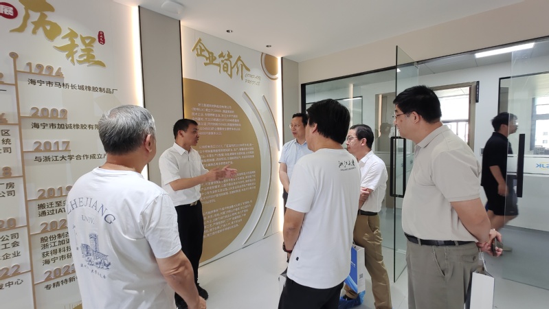 座谈交流结束后,朱勇良会长一行还在浙江加诚新材料股份有限公司董事长李群峰、公司销售总监马洪峰等的陪同下参观了加诚新材料股份有限公司展览馆及产品研发试验室。