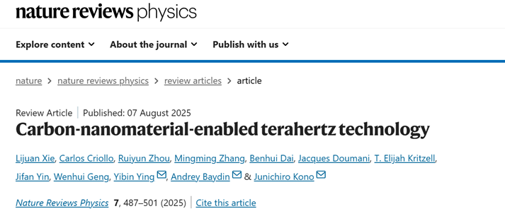 浙江大学智能生物产业装备创新团队(IBE)谢丽娟教授、应义斌教授联合美国莱斯大学Junichiro Kono教授团队,应邀在国际权威综述期刊Nature Reviews Physics2024年影响因子:39.5)上发表题为“Carbon-nanomaterial-enabled terahertz technology”的综述论文。文章系统总结了碳纳米材料在太赫兹(Terahertz, THz)技术领域的最新研究进展,并重点介绍了IBE团队在该方向上的代表性成果,为下一代THz器件的开发提供了重要理论参考。