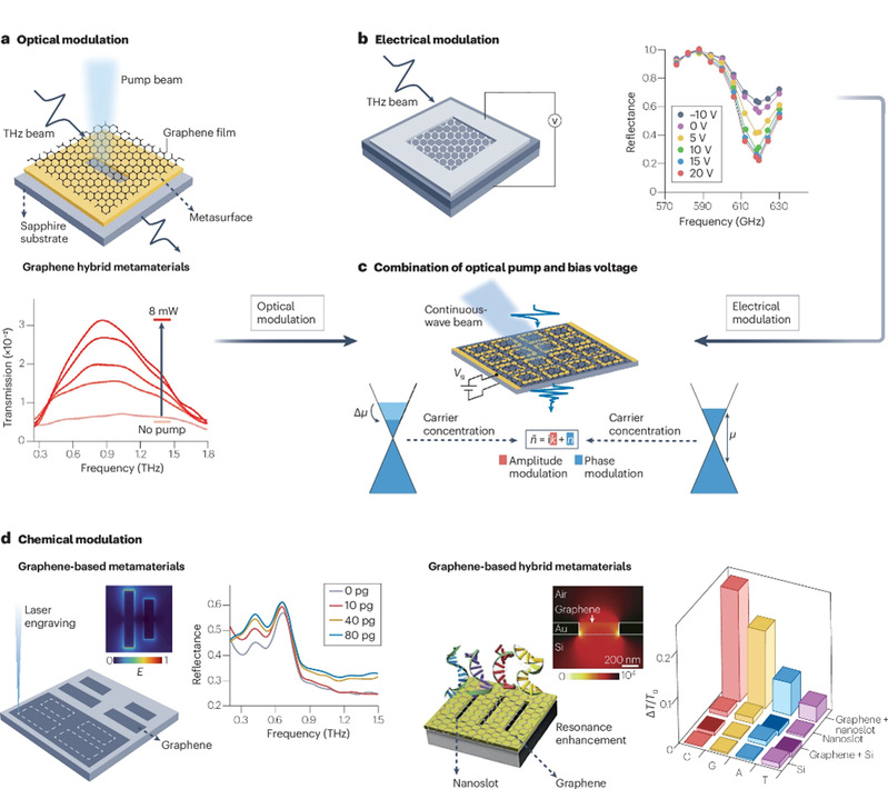 THz调制方面,碳纳米材料可通过光激发、电场、应变和化学掺杂等多种外部刺激实现THz波的动态调控。石墨烯基超表面结合高掺杂石墨烯和THz纳米缝隙天线,在光泵浦下实现了80%的调制深度和1.83 ps的快速载流子衰减时间。通过电压调控费米能级,石墨烯调制器实现了100%的调制深度和超过100 MHz的调制速度。