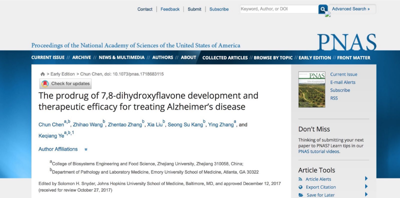 In January 2, 2018, PNAS(Proceedings of the National Academy of Sciences) published online a paper entitled “The prodrug of 7,8-dihydroxyflavone development and therapeutic efficacy for treating Alzheimer’s disease”, which is a cooperative research achievement of Dr. Ye Keqiang, a tenured professor of Emory University, and a BEFS research team led by Prof. Zhang Ying. The research synthesized the prodrug R13 through a specific chemical modification of the active site of 7, 8-dihydroxyflavone, in order to improve the oral bioavailability and the brain exposure level, and elucidated the molecular mechanism of its treatment of Alzheimer disease.