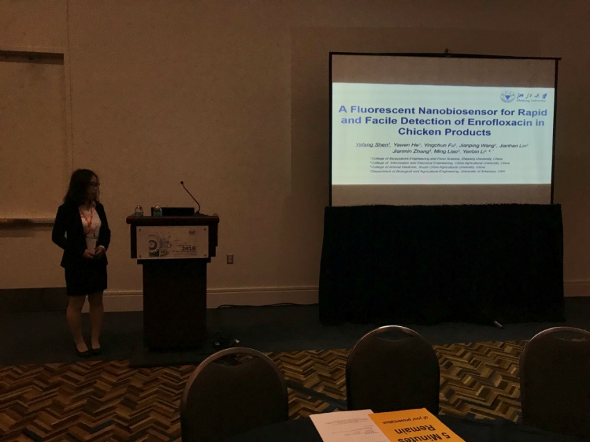 ASABE is the most authoritative academic organization in the field of agricultural engineering. The annual conference covers almost all frontier topics of agricultural engineering, such as agricultural robots, food safety engineering, machine vision and biosensors,and attracted experts, scholars and students from the agricultural engineering fields around the world to participate. Associate professor Fu Yingchun, and the project student participant Shen Yafang, who are mainly engaged in the rapid detection of veterinary drug residues in the Wal-Mart project, presented the oral report entitled “A novel electrochemical biosensor based on magnetic-separation/concentration-signal-amplification in-one method for chloramphenicol detection” and “A fluorescent nanobiosensor for rapid and facile detection of enrofloxacin in chicken products”.