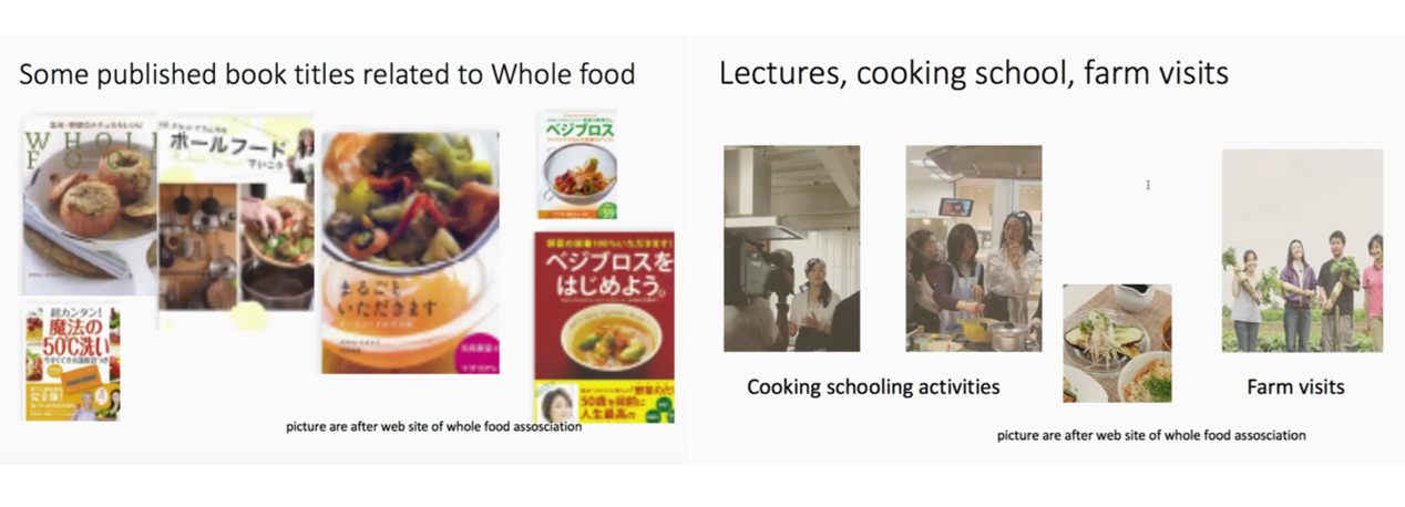 So why noteating whole which provides us perfect nutrition? Dr. Tanaka introduced theidea of whole food and its development. Japanese traditionally tried to use oreat everything they caught or collected from wild-life (In Japanese, Marugotoshoku 丸ごと食), because they think thatany healthy animals’ composition is the same as theirs. In 2000s, whole foodconcept met “shokuiku食育”, then expanded as a movement to harmonize diet, health, life andenvironment. And there are more activities on whole food in Japan in recentyears, such as book publication, seminar and cooking school, visiting farms,etc.